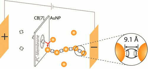 Electrokinetic assembly of one-dimensional nanoparticle chains with cucurbit[7]uril controlled subnanometer junctions.